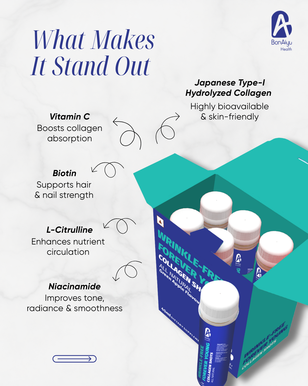 Wrinkle-Free Forever Young Collagen Shots are specially formulated to nourish your skin, hair, nails, and joints from within. Each shot delivers a potent blend of hydrolyzed collagen peptides and Vitamins, helping to improve skin elasticity, support joint health, and promote youthful vitality. Convenient, delicious, and ready-to-drink — experience beauty from the inside out.